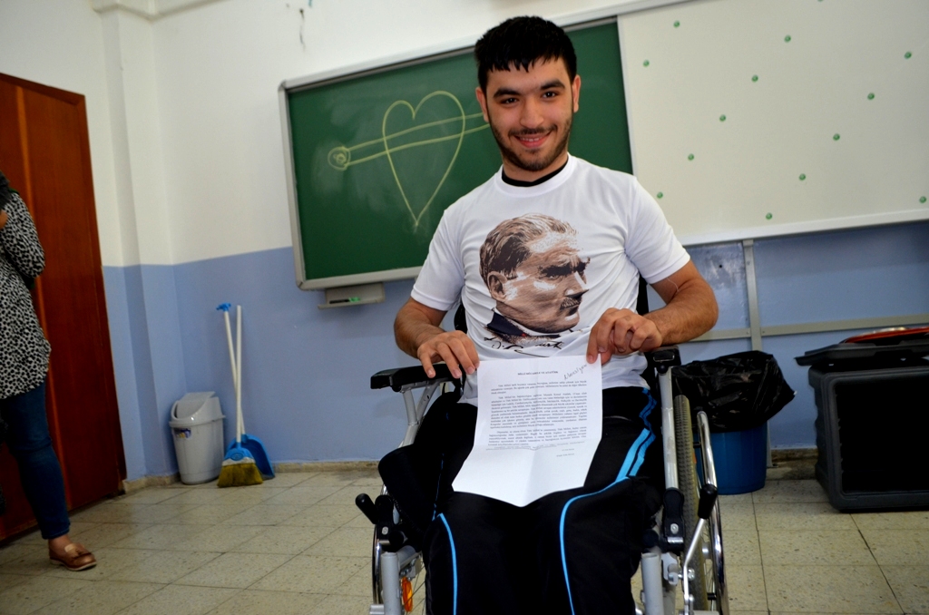 Bedensel engelli Ümit Yılmaz’ın kompozisyonu mansiyona layık görüldüğü için hediyesini verdik. Sevgili Ümit’i bu güzel duyguları ve yazdığı güzel kompozisyonundan dolayı kutluyoruz. Bu tür etkinliklerimiz bundan sonra da devam edecektir. Atatürk’ü anlatmaya, düşüncelerini yaşatmaya devam edeceğiz. Ümit Yılmaz’ın başarısından dolayı hem kendisini, hem ailesini hem öğretmenlerini ve okulunu tebrik ediyoruz” ifadelerini kullandı.