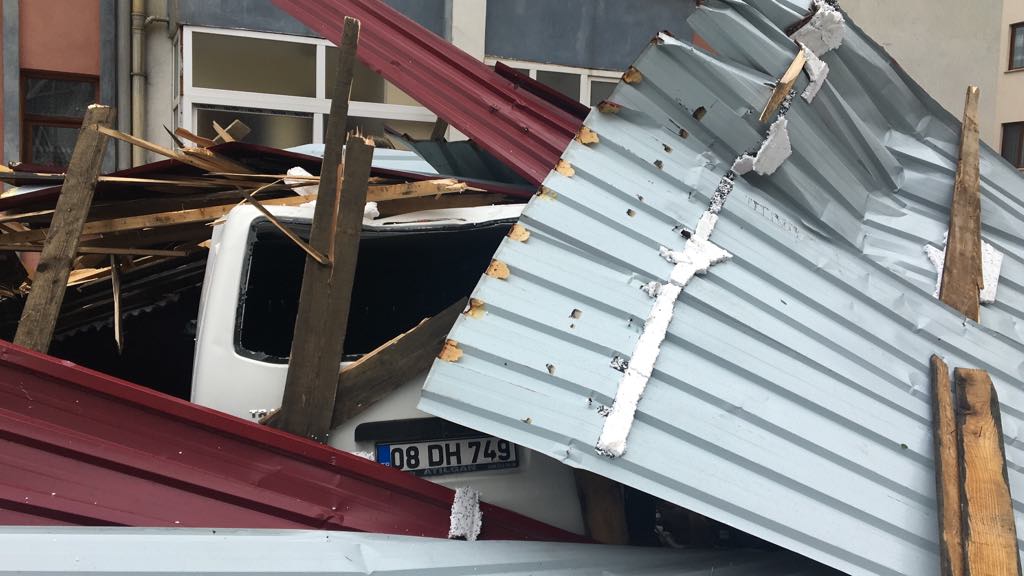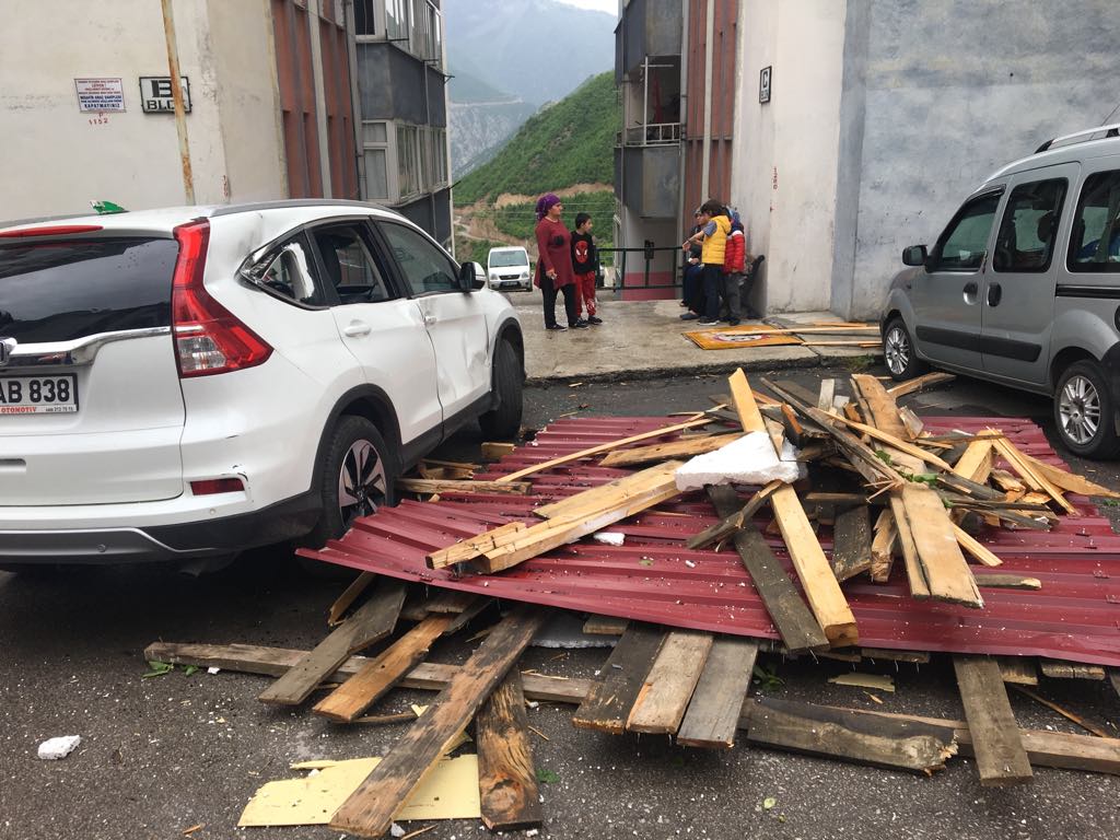 Korku dolu anların yaşandığı Artvin’de, aniden bastıran yağmur ve çıkan fırtına dün saat 14.30’da Balcıoğlu Mahallesi Yaz Kent Sitesinde meydana geldi. Fırtına nedeniyle Yaz Kent sitesinde beş katlı bir binanın çatısı uçtu. Park halindeki 11 araç, fırtınanın sürüklediği ve evlerin çatısından kopan malzemelerden dolayı ağır hasar gördü.