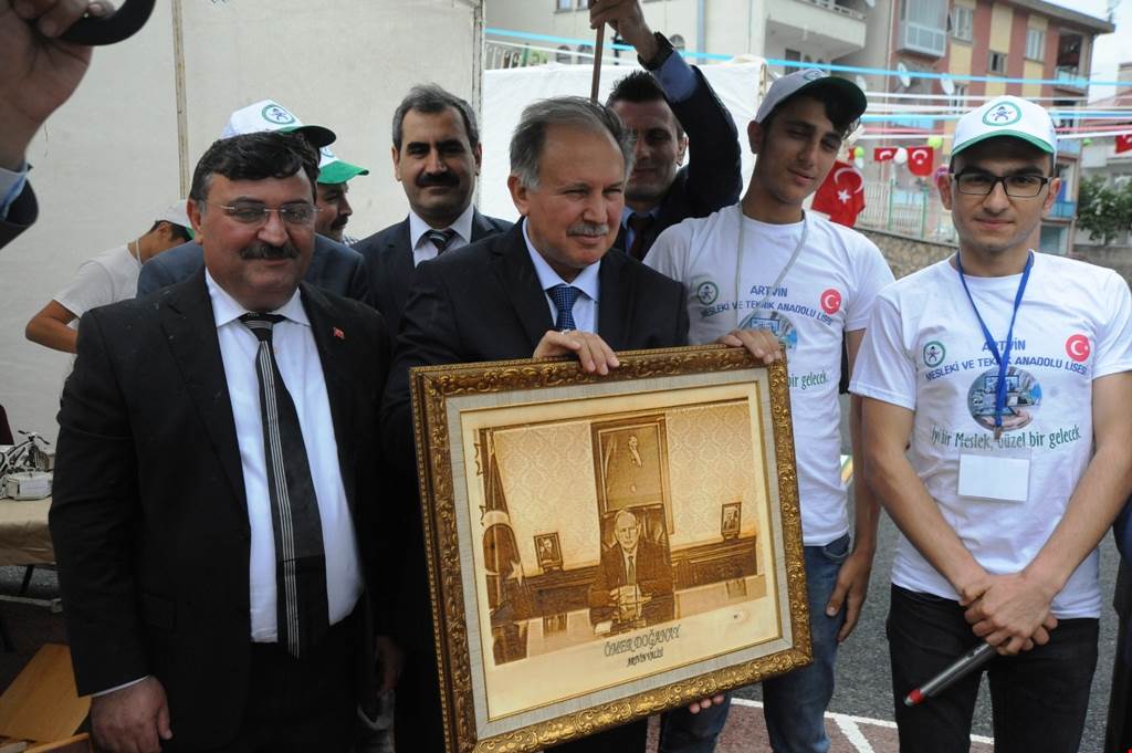 Açılan fuar gezildikten sonra öğrenciler yakma yöntemi ile ahşap üzerine yapmış oldukları Vali Ömer Doğanay’ın resminin olduğu tabloyu Vali Doğanay’a hediye ettiler.