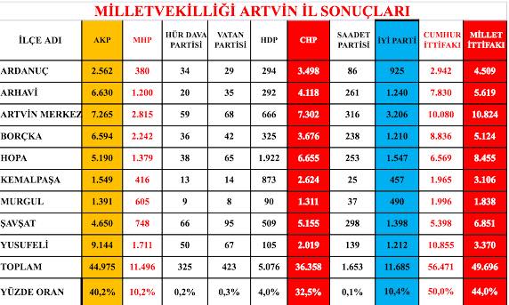 Artvin’de milletvekilliği seçimlerinde ise Adalet ve Kalkınma Partisi ile Cumhur ittifakına en büyük destek yine Yusufeli ilçesinden geldi. AK Parti Yusufeli ilçesinde oyların yüzde 63.3’ünü alarak en fazla oyu burada almış oldu. MHP ise bu ilçede yüzde 11.8 oy alırken Cumhur ittifakının bu ilçede aldığı oy miktarı 75.1 oldu. AK Parti’ye oran olarak Ardanuç’ta yüzde 32.8, Arhavi’de yüzde 48.1, Borçka’da yüzde 45.9, Hopa’da yüzde 30.4, Kemalpaşa’da yüzde 25.9, Merkez’de yüzde 33.5, Murgul’da yüzde 35.3, Şavşat’ta yüzde 36, Yusufeli’nde ise yüzde 63.3 oy verildi. Rakamsal olarak baktığımızda ise oy miktarları şu şekilde gerçekleşti: Ardanuç 2.562, Arhavi 6.630, Artvin Merkez 7.265, Borçka 6.594, Kemalpaşa 1.549, Murgul 1.391, Şavşat 4.650, Yusufeli 9.144.