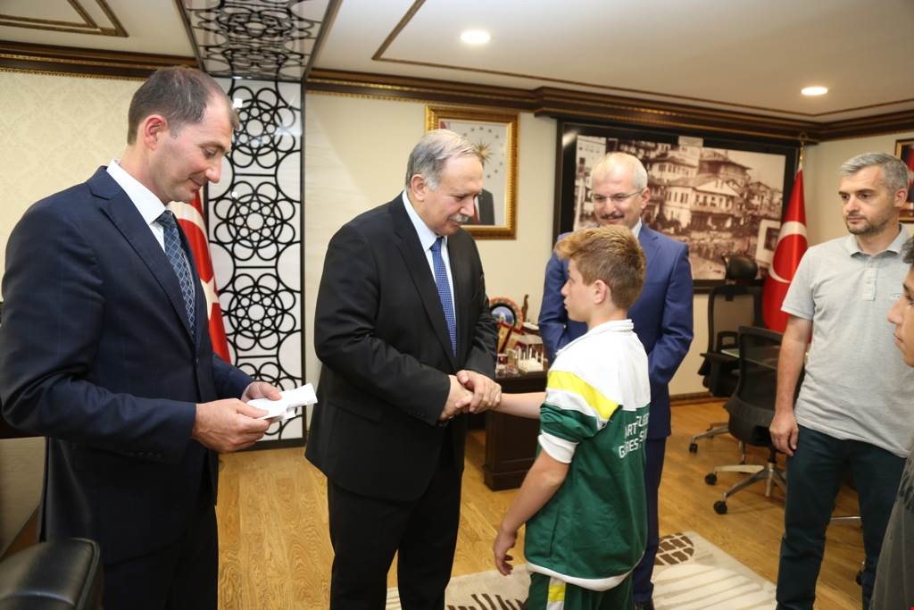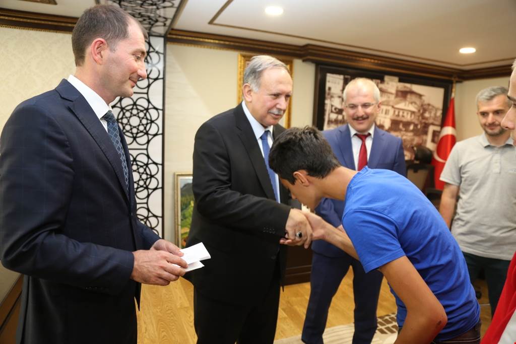 Vali Doğanay, Gençlik Hizmetleri ve Spor İl Müdürü Bahattin Yetim, ilk dörde giren 30-55 kilogram kategorilerinde başarılı olan 25 güreşçi ile antrenörlerini makamında kabul ederek, bir miktar para ile ödüllendirdi.