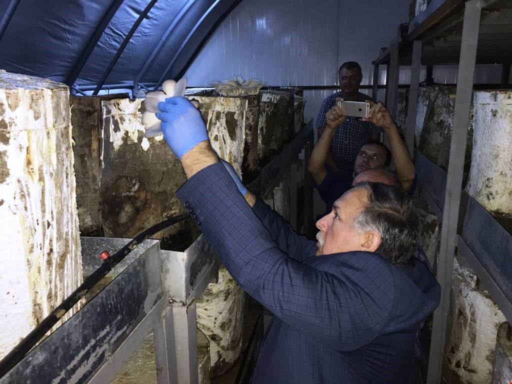 İlk olarak Gıda Tarım ve Hayvancılık Bakanlığının 11. Etap Kırsal Kalkınma Projesinin hibe programları kapsamında köy muhtarı ve aynı zamanda Artvin İli Mantar Yetiştiricileri Birliği Yönetim Kurulu Başkanı Ali Fuat Beyaz ile ev hanımı Meryem Ülker tarafından kurulan kayın mantarı seralarını gezdi.