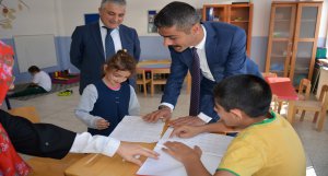 Öğrencileri kendi sınıflarında ziyaret ettikten sonra öğrencilerle birlikte ders etkinlik uygulamalarına katılan Kahveci okuldaki öğretmenlerle yaptığı toplantıda uygulanan eğitim programları hakkında bilgi aldı.