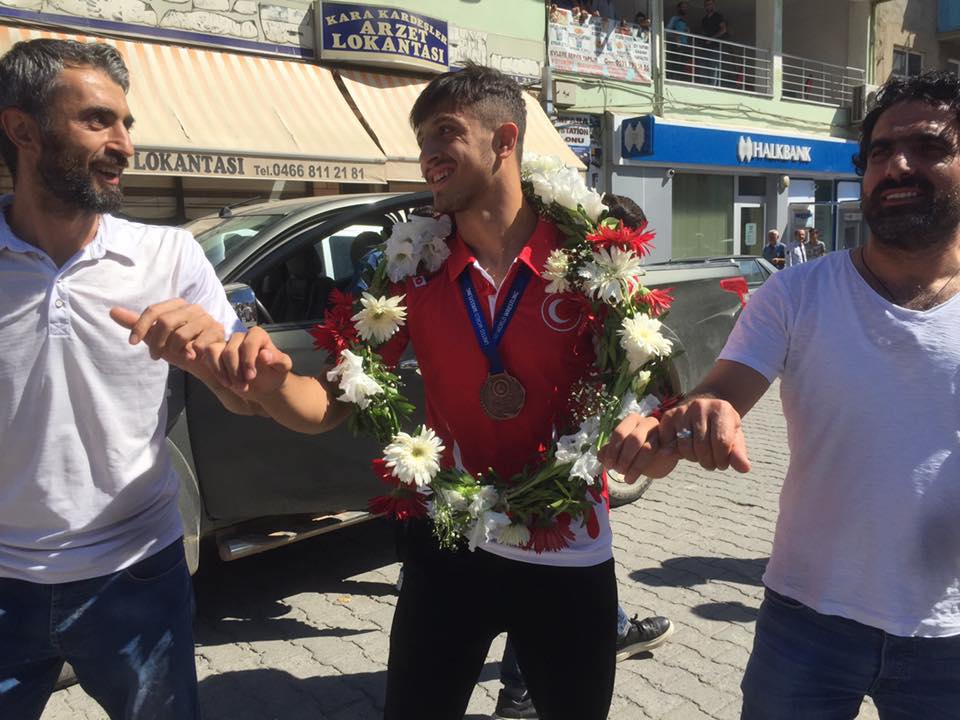 Şampiyon güreşçiye Gençlik Spor ilçe Müdürü ve güreş sever hemşerileri refakat etti.