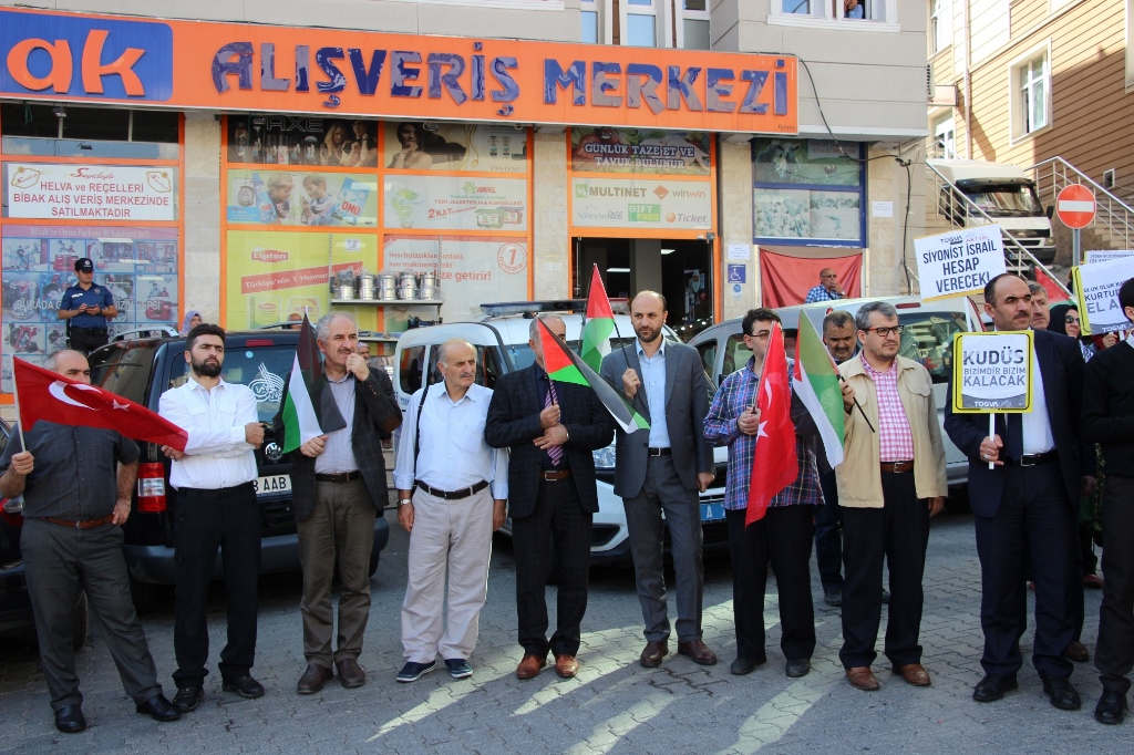 Vatandaşlar burada, Filistin ve Türk Bayrakları açıp, “Siyonist İsrail hesap verecek”, “Kudüs bizimdir bizim kalacak, “Modern firavunlar için yaşasın cehennem”, “Oluk oluk kan aksa kurtulacak El Aksa” sloganları attı.