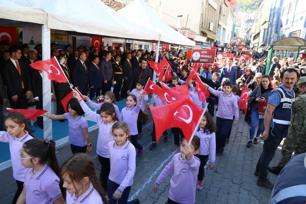 Artvin Valisi Ömer Doğanay’ın valilik makamında tebrikleri kabul etmesiyle başlayan 29 Ekim Cumhuriyet Bayramı kutlamaları Milli İrade Meydanı’ndaki etkinliklerle devam etti.