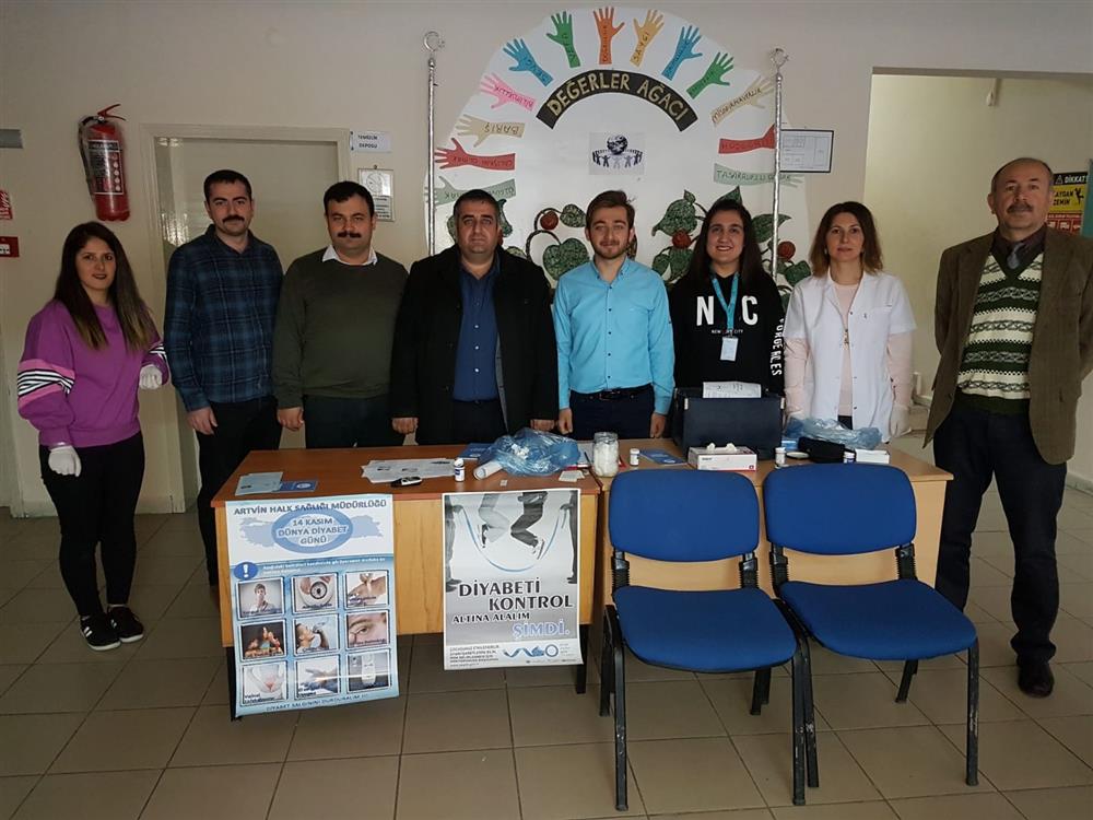Toplumsal sağlığımız için bu kadar önemli bir konuda toplumun farkındalığını arttırmak, bu tehlikenin önemine vurgu yapmak için Dünya Diyabet Günü sosyal sorumluluk projesi kapsamında İl Sağlık Müdürlüğü olarak etkinlik ve farkındalık faaliyetlerinde bulundu. Bu kapsamda Hopa TSM Atatürk Anadolu Lisesi ve Atatürk Ortaokulunda diyabetle ilgili geniş kapsamlı 2 seans şeklinde öğretmen, öğrenci ve okul çalışanlarına eğitim vermiş olup ayrıca okul bahçesinde Sağlıklı Yaşam Aracında bilgilendirme videoları izlettirildi. Şavşat TSM İmam Hatip Lisesi ve ortaokulunda stant açmış olup afiş ve broşürlerden yararlanarak eğitimler düzenlemiş, anlık kan şekeri ölçümü yapmıştır. İl Sağlık Müdürlüğü Obezite ve Kronik Hastalıklar Birimi Atrium AVM’ de, diyabet riski taşıyan aile ve bireylere yönelik, içeriğinde diyabet risk testinin uygulandığı, Boy, kilo ve anlık kan şekeri ölçümünün yapıldığı, eğitici materyallerin (afiş, broşür, kitapçık) kullanıldığı bir etkinlik düzenlendi.