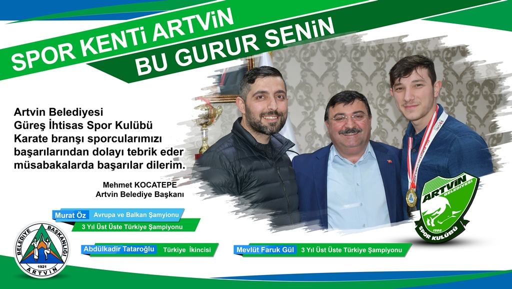Spor Kenti Artvin Bu Gurur Senin! Artvin Belediye Başkanı Mehmet Kocatepe, birçok branşta Artvin’in ismini uluslararası ve Türkiye şampiyonalarında duyuran sporcuları tebri