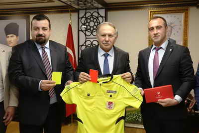 Ziyaretin sonunda Başkan Yazgül, Vali Doğanay’a hakem forması, sarı kart, kırmızı kart ve kokart hediye etti.