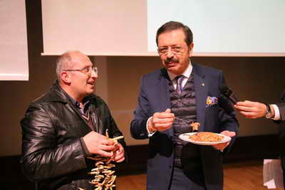 TOBB Başkanı M. rifat Hisarcıklıoğlu kürsüde konuşma yaptığı sırada Artvin’in ilk coğrafi işaret tescili alan ‘pucuko’ yemeğinin tadına baktı.