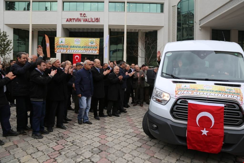 Artvin Valiliği ve İl Gıda Tarım Hayvancılık Müdürlüğü koordinesinde Artvin Arıcılar Birliği tarafından düzenlenen destek kampanyası ile Artvin Valiliği önüne getirilen ballar buradan bir araca yüklenerek Afrin’e gönderildi.