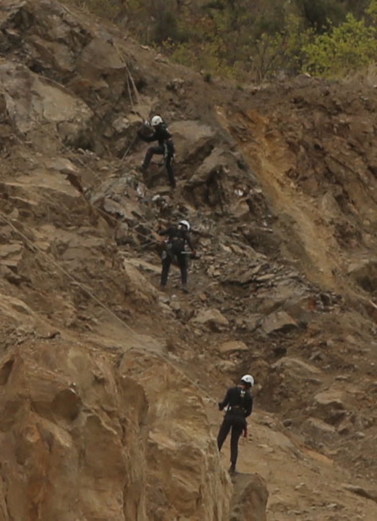 Artvin- Şavşat, karayolu kenarlarındaki yamaçlardan taş ve kaya parçalarının düşmesini önlemek için kayalıklara tırmanan endüstriyel dağcılar, yamaçta bulunan ve her an düşme tehlikesi içinde olan kayaları kontrolü bir şekilde düşürerek temizliyor.