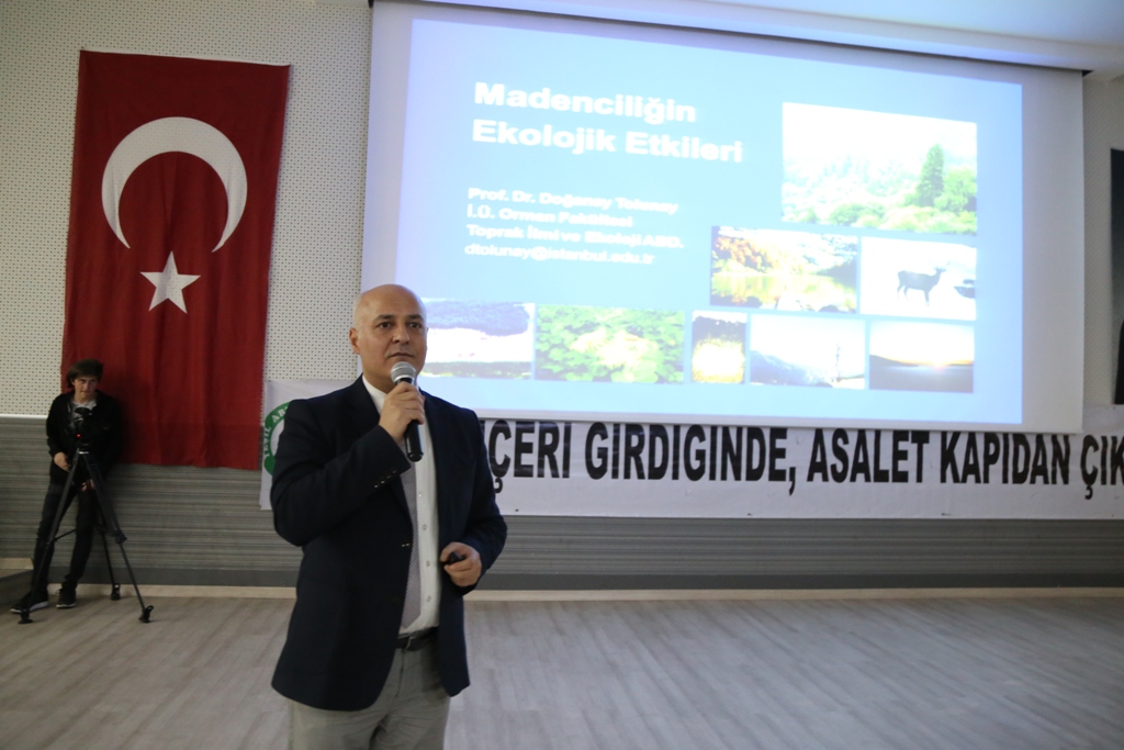 Panelin 2'nci sunumu “Madenciliğin Ekolojik Etkileri” başlığıyla Prof. Dr. Doğanay Tolunay tarafından gerçekleştirildi. Tolunay sunumunda madencilik faaliyetinin en başından, sondaj çalışmaları işlemlerinden, en sonuna hatta madencilik faaliyetleri bittikten sonra bile zararların devam ettiğini vurguladı.