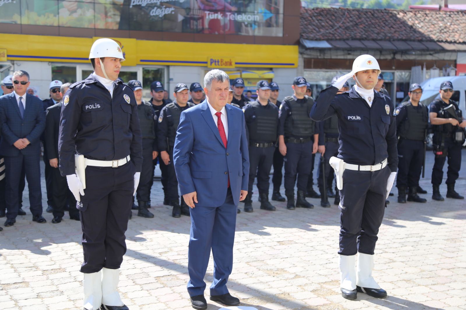 Artvin Valiliği önünde düzenlenen tören İl Emniyet Müdürü Mehmet Selvi’nin Atatürk Anıtı’na çelenk sunumuyla başladı.