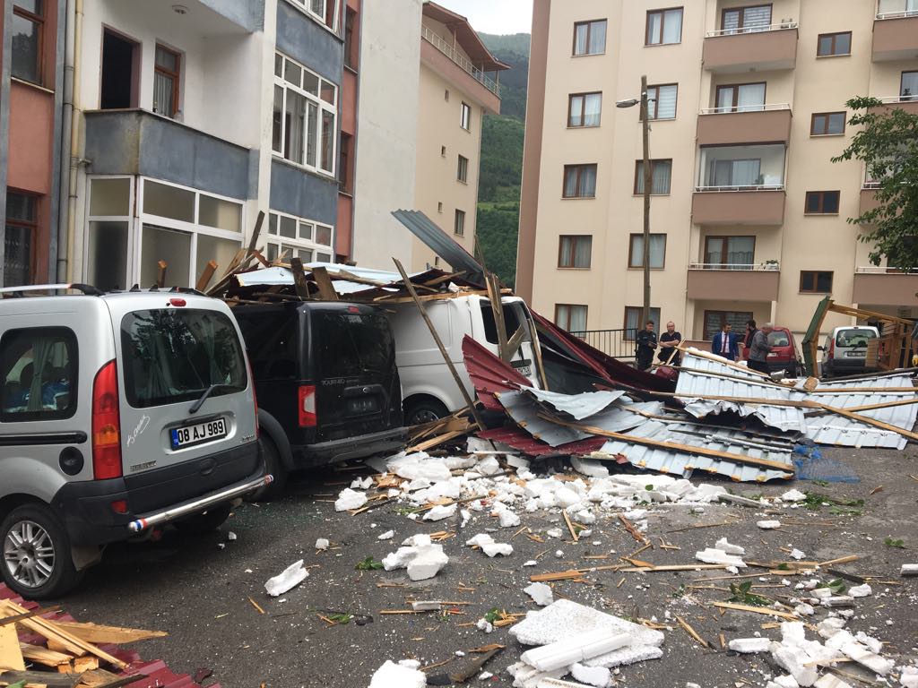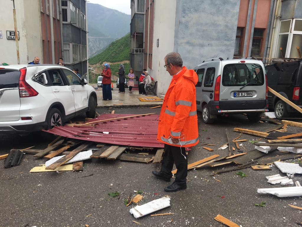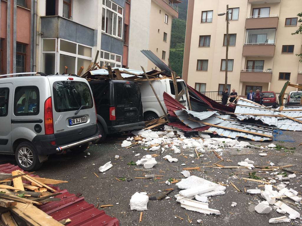 Korku dolu anların yaşandığı Artvin’de, aniden bastıran yağmur ve çıkan fırtına dün saat 14.30’da Balcıoğlu Mahallesi Yaz Kent Sitesinde meydana geldi. Fırtına nedeniyle Yaz Kent sitesinde beş katlı bir binanın çatısı uçtu. Park halindeki 11 araç, fırtınanın sürüklediği ve evlerin çatısından kopan malzemelerden dolayı ağır hasar gördü.