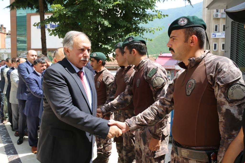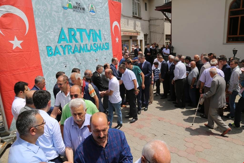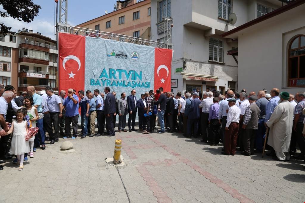 Artvin Valiliği ve Artvin Belediyesince Atapark önünde düzenlenen törene katılan Artvin Valisi Ömer Doğanay ve beraberindeki protokol üyeleri, kent halkıyla bayramlaşarak bir süre sohbet etti.