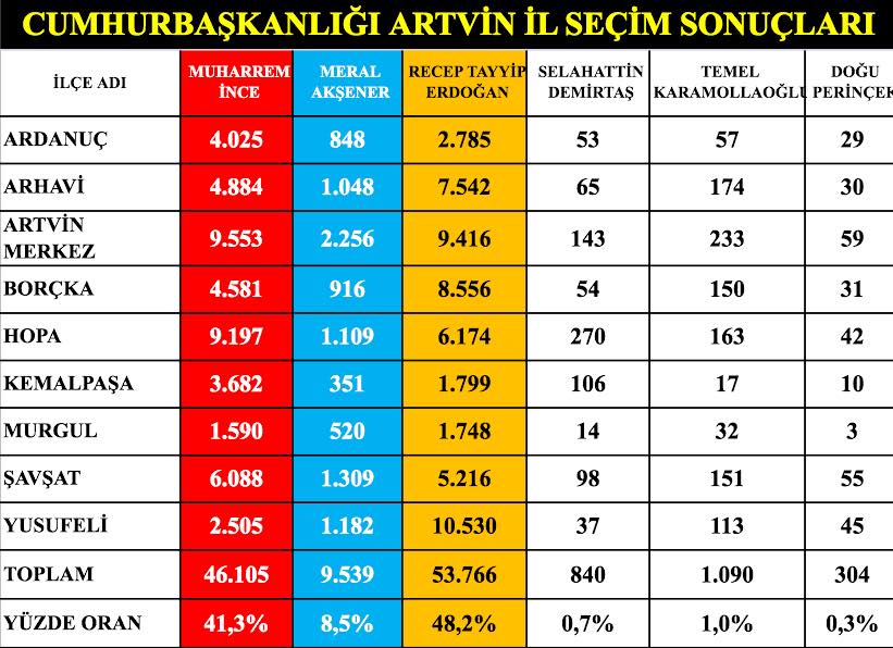 YSK tarafından açıklanan rakamlarda Cumhurbaşkanı Erdoğan, geçerli olan oyların yüzde 48.2’sini alarak Artvin’de birinci sırada yer alan aday oldu. Erdoğan’ın aldığı oy miktarı ise 53 Bin 766 olurken Erdoğan’ın oransal olarak en çok oy aldığı ilçe Yusufeli olurken, en az oy aldığı ilçe ise bizzat Erdoğan tarafından ilçe yapılan Kemalpaşa ilçesi yüzde 30.2 ile oldu. Cumhurbaşkanı Erdoğan’ın ilçelere göre aldığı oy rakamları ise rakamları şu şekilde oldu. Ardanuç yüzde 2 Bin 785, Arhavi 7 Bin 542, Artvin merkez 9 Bin 416, Borçka 8 Bin 556, Hopa 6 Bin 174, Kemalpaşa Bin 799, Murgul Bin 748, Şavşat 5 Bin 216, Yusufeli 10 Bin 530 oldu. Bu rakamların oranlara vurulmuş halinde ise Cumhurbaşkanı Erdoğan, Ardanuç’ta yüzde 35.7, Arhavi’de yüzde 54.9, Borçka yüzde 59.9, Hopa yüzde 36.4, Kemalpaşa yüzde 30.2, Merkez yüzde 43.5, Murgul yüzde 44.7, Şavşat yüzde 40.4 ve Yusufeli ise yüzde 73.1 olarak gerçekleşti.