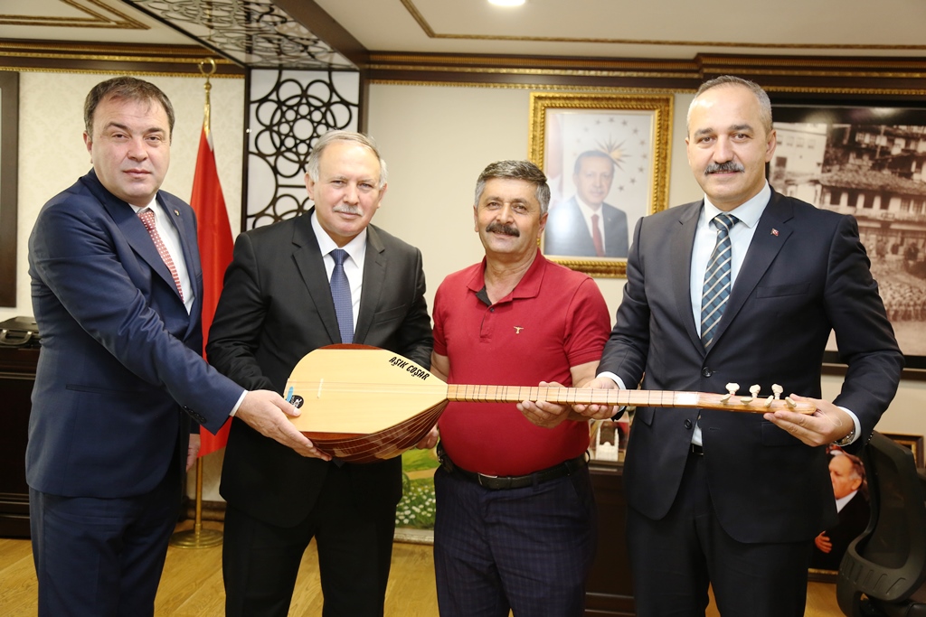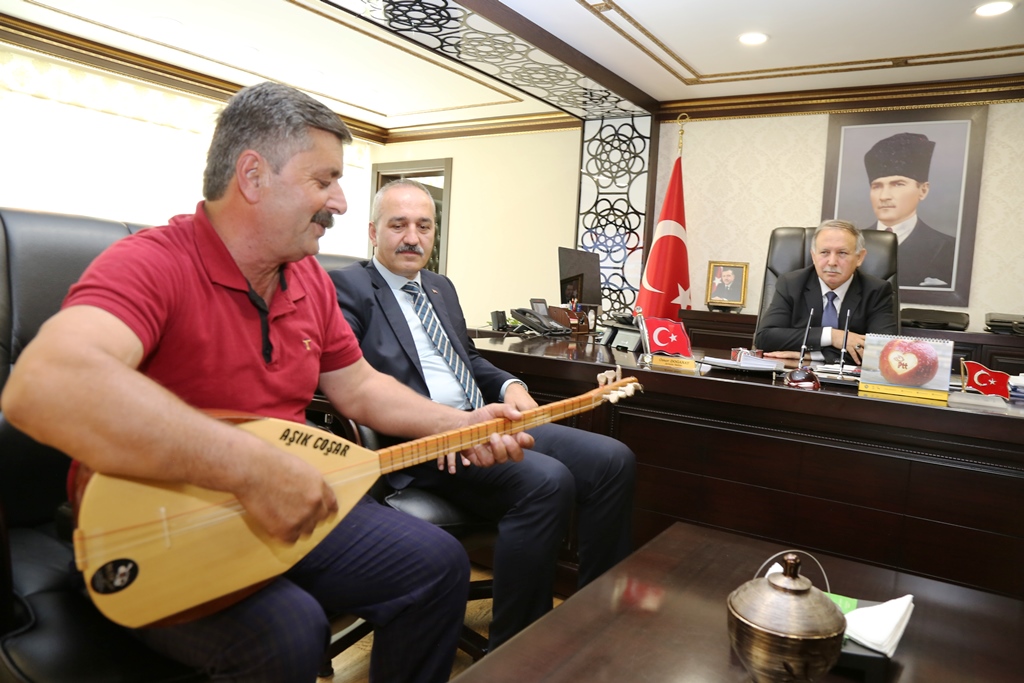 Başkanlar Kurt ile Dağ beraberindeki Aşık Coşari ile birlikte Vali Doğanay’ı ziyaret ederek, sazı Vali Doğanay’a takdim etti.
