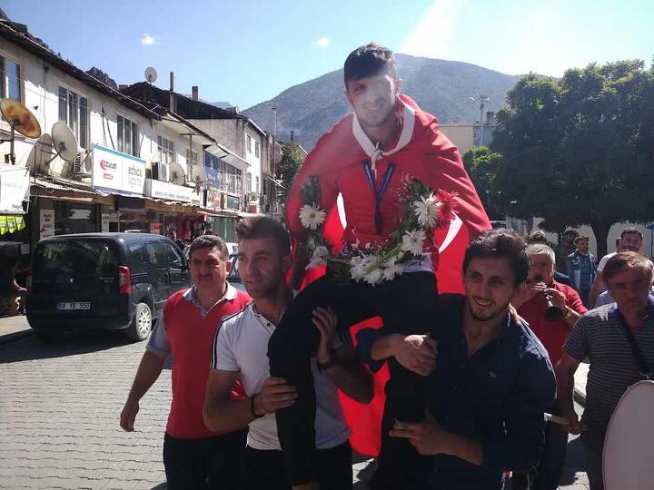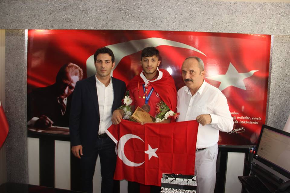 Şampiyon güreşçiye Gençlik Spor ilçe Müdürü ve güreş sever hemşerileri refakat etti.