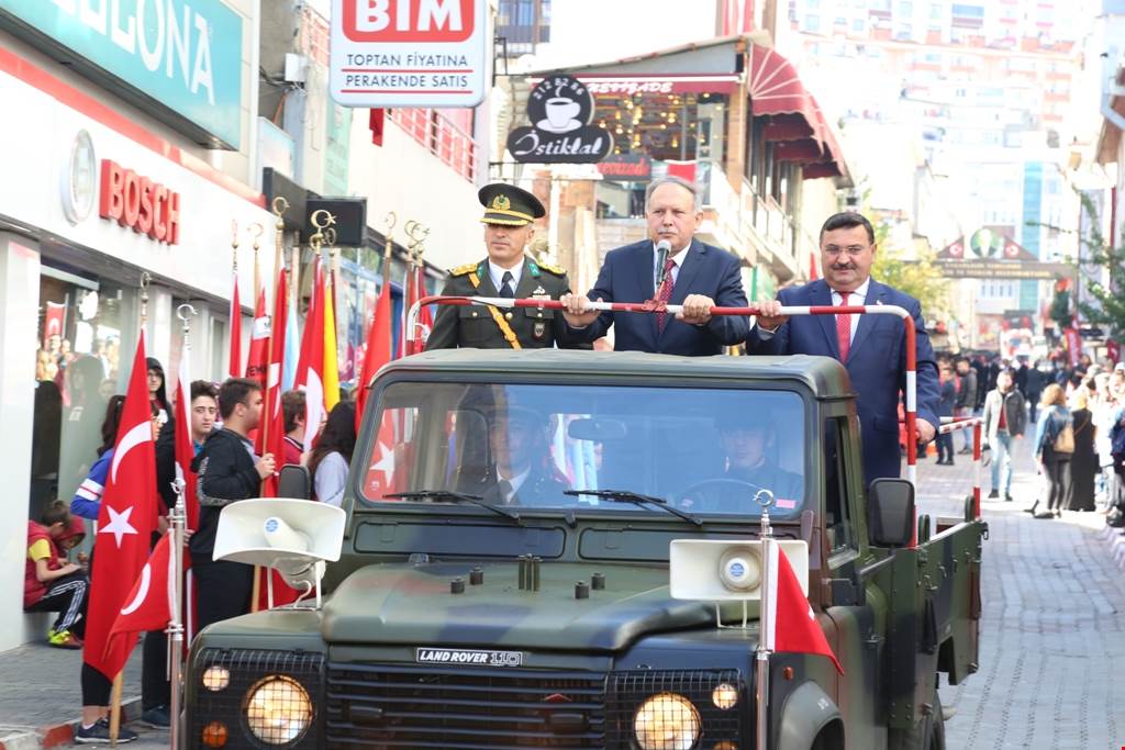 Burada ilk olarak Vali Doğanay, Belediye Başkanı Mehmet Kocatepe ve Garnizon Komutan vekili Piyade Albay Mehmet Gazneli askeri araç üzerinde kutlamaları izlemeye gelen vatandaşların bayramını kutladı.