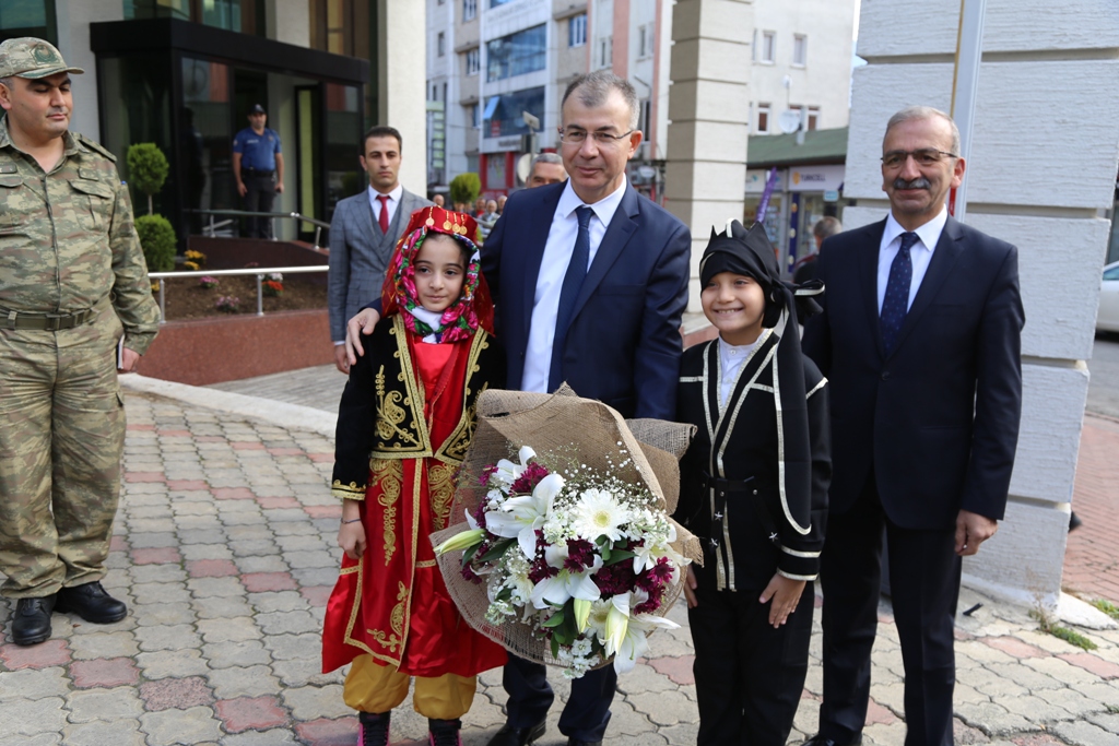 Valilik önünde kent protokolünce karşılanan Vali Doruk’a burada yöresel kıyafet giymiş çocuklar çiçek verdi.