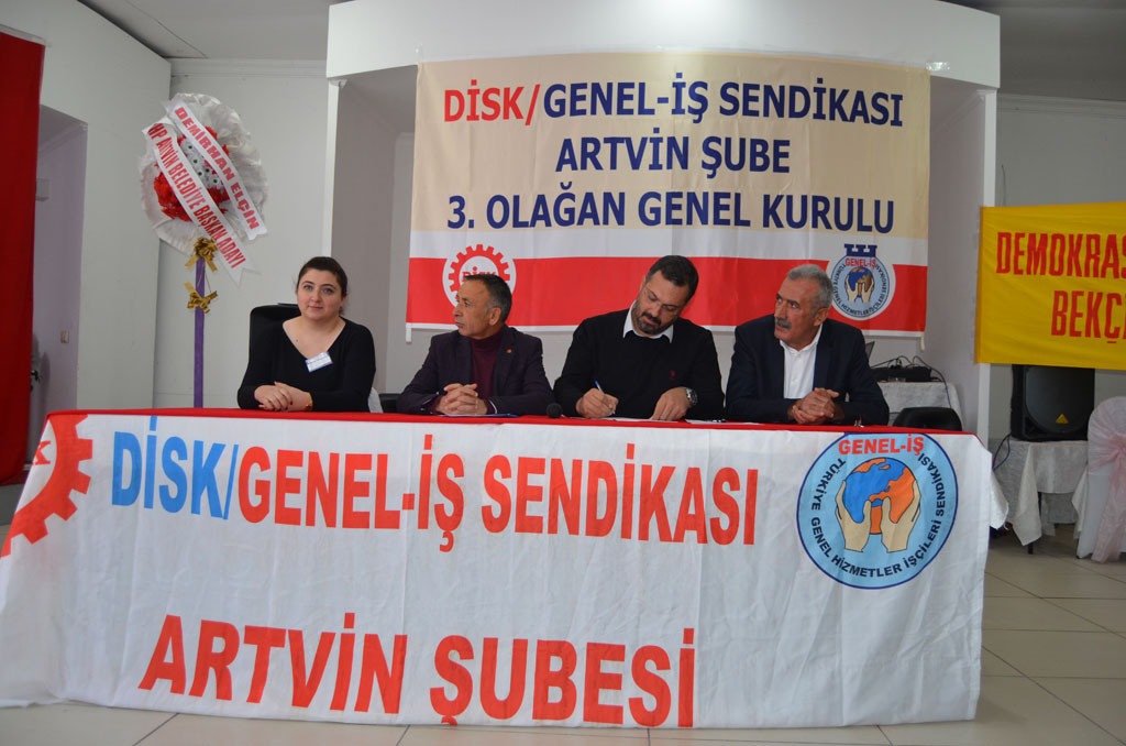 Artvin Doğa Restoranda yapılan DİSK Genel İş Sendikası Artvin Şubesi 3’üncü Olağan Kongresine, Türkiye Devrimci İşçi Sendikaları Konfederasyonu (DİSK) Genel Merkez Yönetim üyesi TİS Daire Başkanı Mahmut Şengül, Ankara 2 nolu Şube Başkanı Ozan Doğan, Disk Samsun Şube Sekreteri Yaşar Aslankaya, Artvin Belediye Başkanı Mehmet Kocatepe, Genel İş Sendikası Eğitim Daire Başkanı Hüseyin Yaman, Ardanuç Belediye Başkanı Yıldırım Demir, CHP İl Başkanı Ahmet Biber, CHP Artvin Belediye Başkan Adayı Demirhan Elçin, davetliler ve sendika üyeleri katıldı.