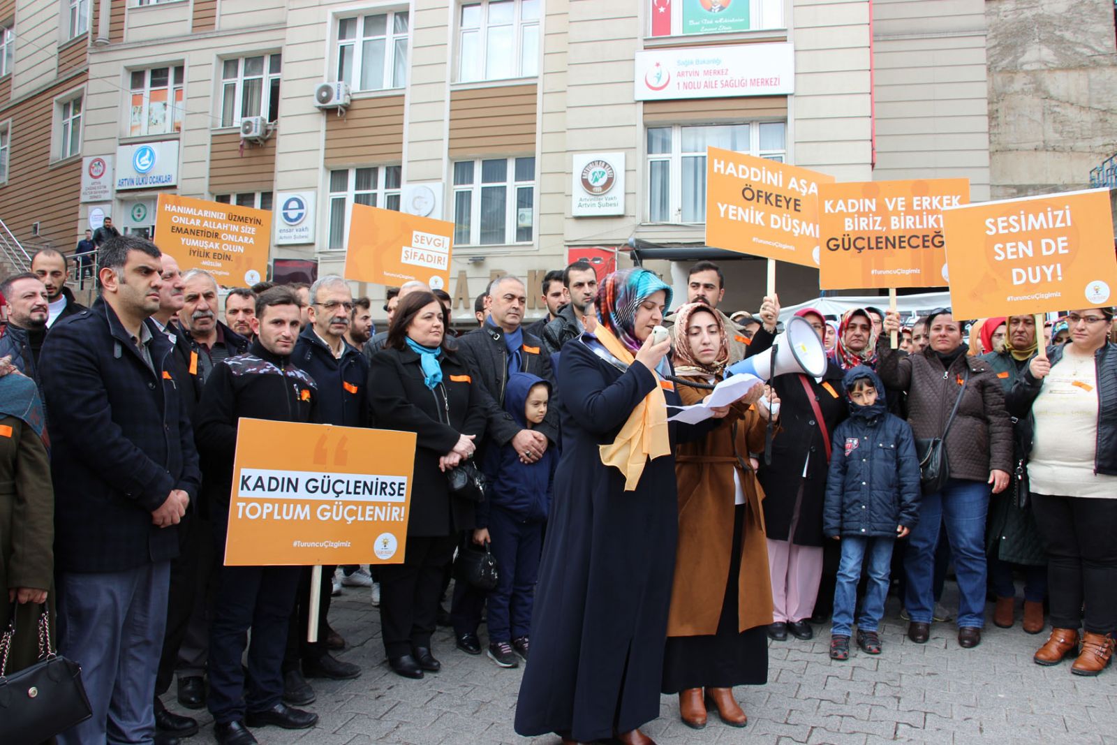 AK Parti Artvin Kadın Kollarınca düzenlenen etkinlik kapsamında Atatpark’da toplanan grup ellerindeki dövizlerle Halitpaşa Meydanına kadar yürüdü.