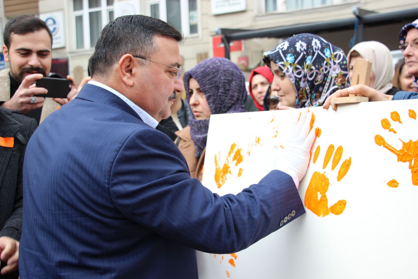 Açıklamanın ardından vatandaşlar turuncu boyayla beyaz zemin üzerine kadına şiddete tepki amaçlı el baskısı yaptı.