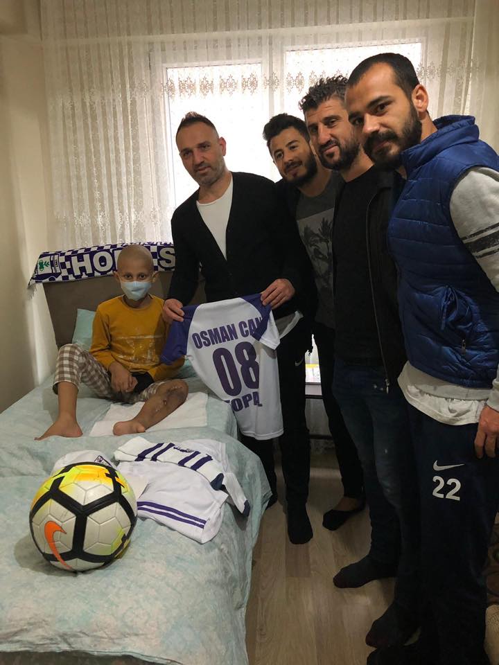 Artvin'in Hopa ilçesinde, tıpta Osteoporoz olarak bilinen kemik erimesi hastalığına yakalanan Osman Can Topal'a, Hopasporlu futbolcu ve teknik heyetten anlamlı ziyaret. TFF 3. Lig’de gururumuz Hopaspor sadece yeşil sahada değil sosyal sorumluluk anlamında da önemli işlere imza atıyor. Artvin'in Hopa ilçesinde, tıpta Osteoporoz olarak bilinen kemik erimesi hastalığına yakalanan Osman Can Topal'ın (11) sağlığına kavuşabilmesi için bir umut Küba'ya götürülmesine karar verildi. Maddi imkanı olmayan ailenin tedavi masraflarını karşılayabilmesi kampanya başlatıldı. Sosyal medya üzerinden duyurulan kampanyada küçük çocuğun Küba'da tedavi olabilmesi için gerekli para 2 günde toplandı. Bunun üzerine Osman Can’ın Küba yolculuğu öncesi Hopasporlu futbolcu ve teknik heyetten moral ziyareti geldi. Minik atmacayı evinde ziyaret eden heyet kendisine Hopaspor’un lisanlı formasını ve futbol topu hediye etti.