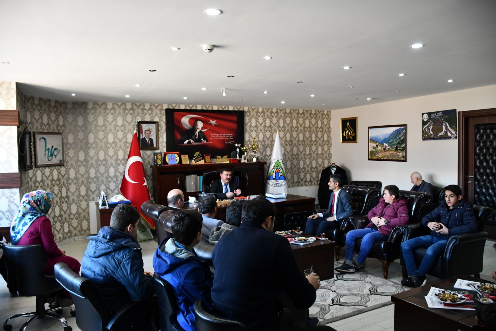 Artvin genelinde ki İmam Hatip Liselerine dereceyle giren ve umre ödülüyle ödüllendirilen 13 öğrenci umre dönüşü Belediye Başkanı Mehmet Kocatepe’yi ziyaret ederek hurma ve zemzem suyu hediye ettiler.
