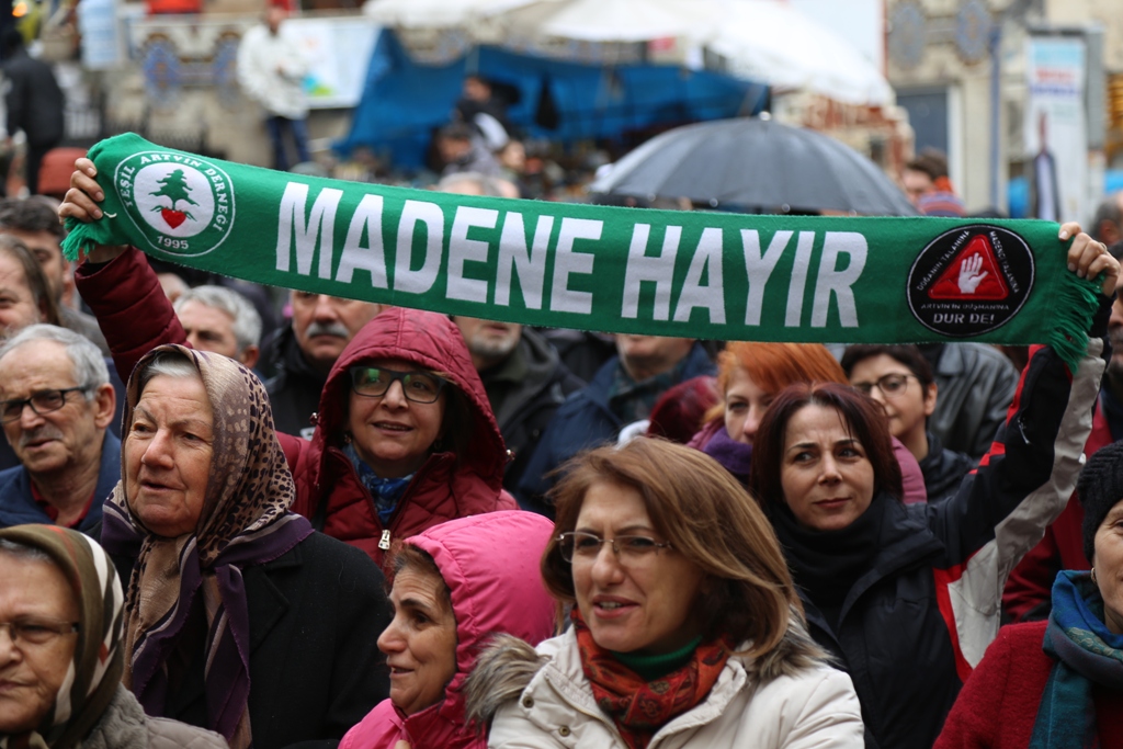 Cerattepe mücadelesi 25 yıldır süren bütün dünyada örnek olmuş bir sivil toplum hareketi ve eşsiz bir mücadeledir. Yaşamı yok eden bu gözü dönmüş doğa katliamına karşı Artvin halkının mücadelesi her zorluğa karşı sürecektir. Bu mücadeleye bütün Artvinlileri, çevre dostlarını, ülkenin gerçek yurttaşlarını bekliyor, Artvin Çevre Platformu adına Yeşil Artvin Derneği olarak saygılar sunuyoruz” dedi. Açıklamanın ardından kalabalık, ‘ Cerattepe geçilmez Artvin halkı yenilmez’, ‘Artvin’de maden istemiyoruz’ gibi sloganlar atarak dağıldı.