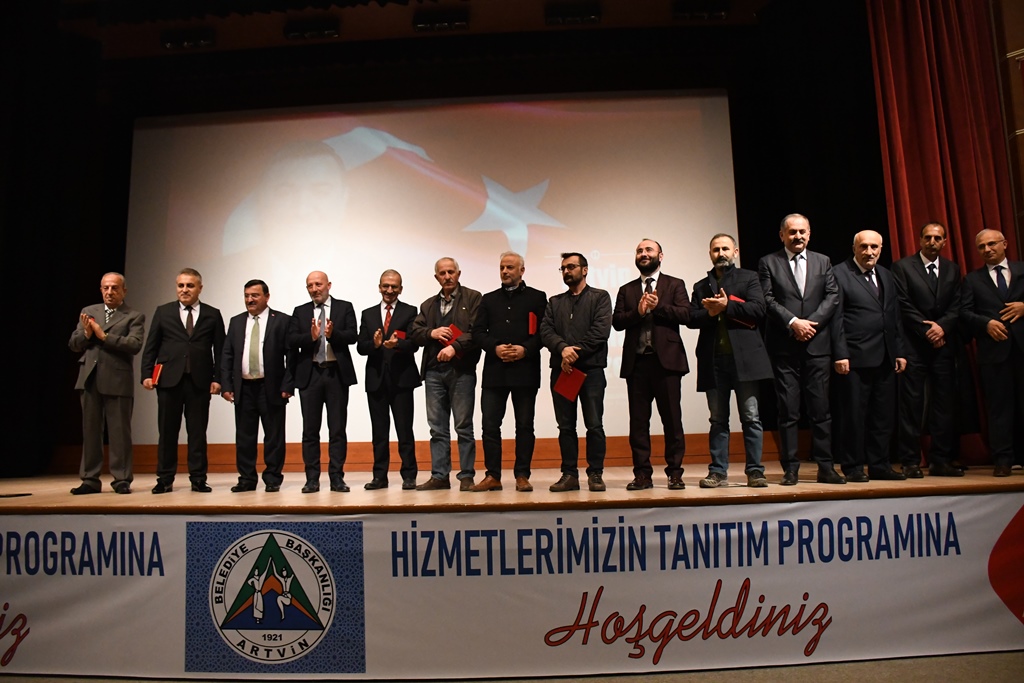 Artvin Belediye Başkanı Mehmet Kocatepe’nin ‘Yüz Akıyla 5 Yıl’ adlı beş yıllık hizmet ve yatırımları anlattığı programa AK Parti Artvin Milletvekili Av. Erkan Balta, AK Parti Artvin İl Başkanı Av. Şenol Alpaslan, MHP İl Başkanı Serdar Kılınç, MHP’nin son genel seçimlerdeki Milletvekili adayı Okan Aktaş, AK Parti Merkez İlçe Başkanı Sevim Cicioğlu, MHP Merkez İlçe Başkanı Özgür Köse, AK Parti Kadın Kolları İl Başkanı Gülser Güray, MHP Kadın Kolları İl Başkanı Fatma Altuntaş, Ülkü Ocakları Başkanı Ogün Erdem, AK Parti ve MHP’li yöneticiler ile Cumhur İttifakının İl Genel Meclis ile Belediye Meclisi’ndeki adayları, Belediye Başkan Yardımcıları Aydemir Akköy, Erkan Yazan ve Zafer İnce’nin yanı sıra, Belediye Meclis Üyeleri ve Belediye Personeli katıldılar. AK Partililer ile MHP’liler salona birlikte girerken toplantının gerçekleştirildiği Ahmet Hamdi Tanpınar Kültür Merkezi salonunda ciddi boyutta kalabalık hazır bulundu. Saygı duruşunda bulunulması ve İstiklal Marşı’nın okunmasının ardından Başkan Kocatepe, bir selamlama konuşması yaparak katılımcılara teşekkür etti. Artvin Belediyesi’nin beş yıllık hizmet ve yatırımlarının anlatıldığı slayt gösterisinin sunumunun ardından AK Parti Artvin Milletvekili Av. Erkan Balta bir konuşma yaparak Artvin Merkez’in beş yılda yaşadığı değişimi anlattı.