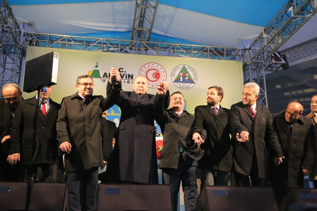 Cumhurbaşkanı Erdoğan, konuşmasının devamında Artvin'e 17 yılda 26 katrilyon yatırım yaptıklarını belirterek; “ Son 17 yılda Artvin'e 26 Katrilyon yatırım yaptık. Dile kolay. 26 Katrilyon yatırım yaptık. Ülkemizin en büyük baraj yatırımlarını buraya yaptık. Çoruh Nehri'ni altın gerdanlıklarla donattık. Türkiye'nin en yüksek ve Dünya'nın 6.cı barajı Deriner Barajı'nı buraya yaptık. Bu barajla birlikte Artvin marka oldu. Sadece ülkemizde değil Artvin, Dünya'da marka oldu. Şimdi de ülkemizin kendi alanında en yüksek barajı olan Yusufeli Barajı ve HES'i yapıyoruz. 1.888 milyon kilovat saat elektrik sağlayacak. Ülkemize 450 Milyon TL katkı sağlayacağız. Artvin şehir girişinde içerisinde sosyal ve kültürel tesislerin, seyir terasları ve gezi alanlarının olduğu Çoruh Park'ı yaptık” diyerek Artvin'e yapılan yatırımlar hakkında bilgi verdi.
