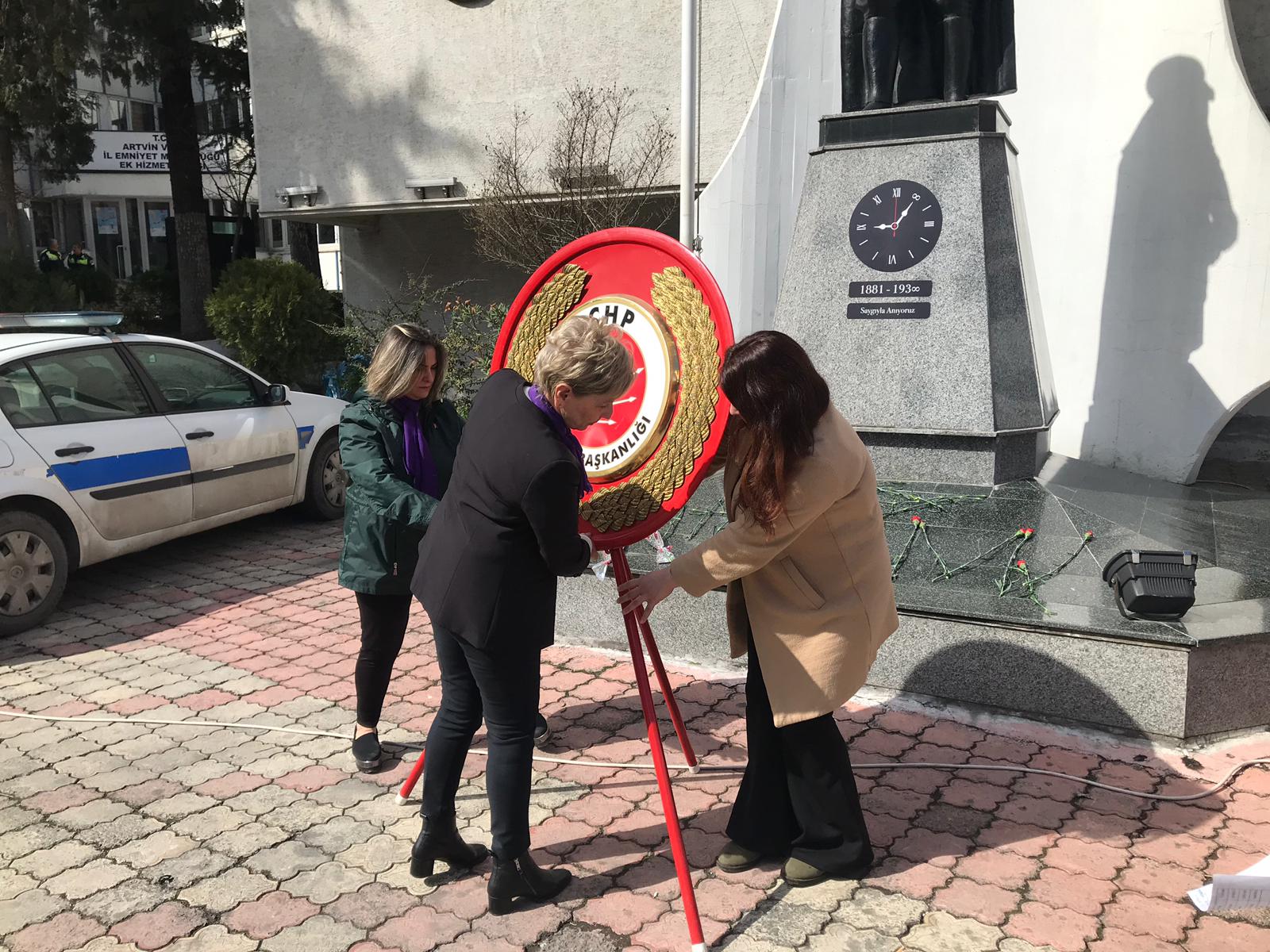 Cumhuriyet Halk Partisi (CHP) Artvin İl Kadın Kolları Başkanlığı 8 Mart Dünya Emekçi Kadınlar Günü nedeniyle Atatürk anıtına çelenk sunarak basın açıklamasında bulundu.