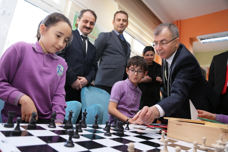 Vali Doruk ile katılımcılar kütüphaneyi gezerek kitapları ve öğrencilerin kullanımına sunulan zekâ geliştirici oyunları inceledi.