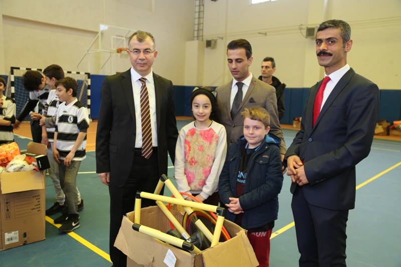 Konuşmanın ardından Vali Yılmaz Doruk, okul temsilcilerini malzemelerini teslim etti.