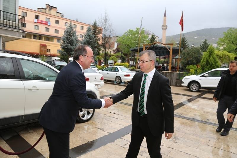 Vali Doruk, Artvin Belediyesi hizmet binası girişinde Başkan Elçin ile belediye personeli tarafından karşıladı.