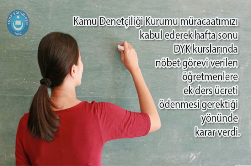 Kamu Denetçiliği Kurumu, mezkur kararla hafta sonu DYK kurslarında nöbet görevi verilmesi gerektiğini açıkça belirtmiş olup gerekli yasal düzenlemelerin Milli Eğitim Bakanlığı’nca yapılması gerekmektedir. Kamu Denetçiliği Kurumu, kararın gereğinin yerine getirilmesi için Milli Eğitim Bakanlığı’na 30 gün süre verdi. Kazanımımızın eğitim camiasına hayırlı olması temenni ederiz.” İfadelerini kullandı.