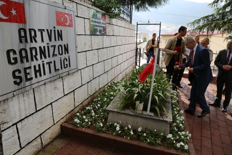 Vali Doruk ve beraberindekiler son olarak Garnizon Şehitliği'ni ziyaret ederek şehitlerimizin mezarlarına karanfil bırakarak, dua okudu.