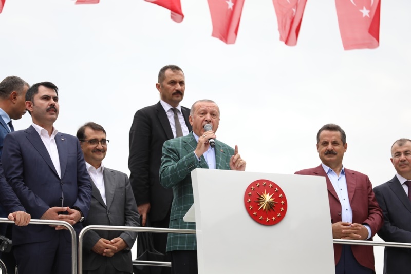 Gezi olaylarından 15 Temmuz'a kadar tüm saldırıların hedefinde Yusufeli Barajı'nın olduğunu belirten Cumhurbaşkanı Erdoğan, “2 Haziran'daki yenileme seçiminde Cumhur İttifakı adayımız Eyüp Aytekin'e vermiş olduğunuz destek sebebiyle şahsım ve partim adına en kalbi duygularla sizleri selamlıyorum. Yusufeli her zaman olduğu gibi yine yanımızda yerini aldı. İnanıyorum ki sizin bize olan desteğiniz, bizim size olan desteğimiz inanıyorum Yusufeli'ni çok daha farklı yerlere tırmandıracaktır. Biraz önce Yusufeli Barajı inşaatını helikopter ile inceleme fırsatını buldum. Gerçekten muhteşem bir eser ortaya çıkıyor. Zaten Artvin adeta bir barajlar şehri. Dünyada eşi benzeri olmayan bir şehir. Kullanma suyundan, içme suyuna elektrik enerji üretimine varıncaya kadar her şeyiyle bir barajlar şehri Artvin. Şimdi ise Yusufeli çok daha farklı bir konuma tırmanıyor. Kendi sınıfında ülkemizin en büyük, dünyanın en yüksek üçüncü eseri olacak Yusufeli Barajı'nı ülkemize kazandırmak için verdiğimiz mücadelenin en yakın şahidi sizlersiniz. Baraj inşasının sürdüğü son 6 yılda ülkemizde yaşanan Gezi olaylarından tutun da 15 Temmuz'a kadar tüm saldırıların hedefindeki yerlerden biri hep bu eser olmuştur. Yurt dışından yurt içine kadar pek çok çevre Yusufeli Baraj inşasına engel olmak için her türlü çabayı göstermişlerdir. Çünkü bunların bu ülkede bir dikili ağacı yok. Bir ağaç mı dikeceksiniz onun da karşısına dikilirler. Yaptıkları iş hep budur. Hamdolsun biz milletimizle el ele verdik. Dayanışma içine girdik. Özellikle de sizlerle el ele vererek tüm bu sıkıntıları aştık ve baraj inşaatına devam ettik. Barajın yapımında özellikle yüklenici firmanın bu noktadaki kararlılığını huzurlarınızda alkışlıyorum” şeklinde konuştu.