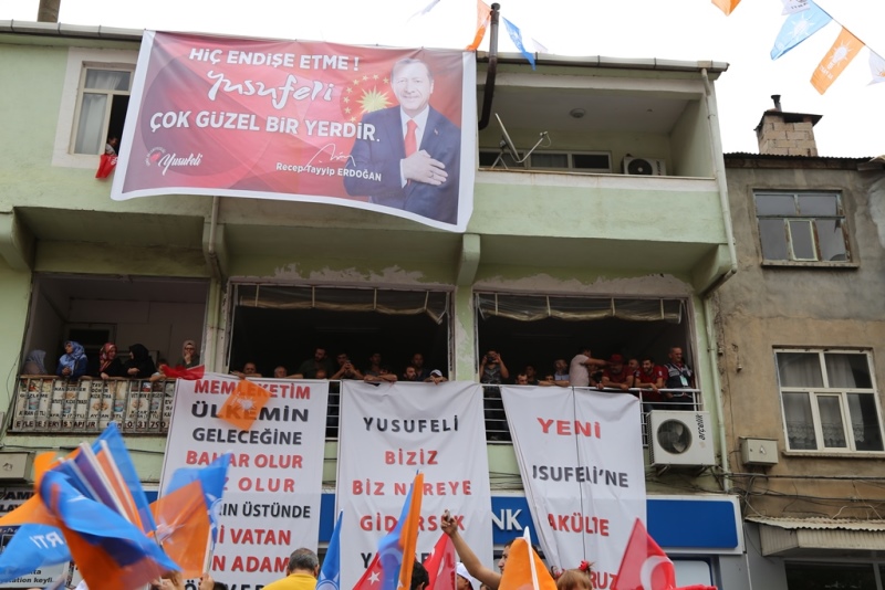 Cumhurbaşkanı Erdoğan, konuşmasını tamamladıktan sonra Yusufeli Belediyesi’ni ziyarete giderken yoğun ilgiyle karşılaştı.