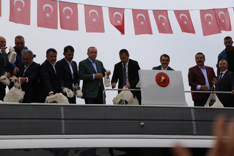 Baraj suları altında kalacak olan Yusufeli ilçesinde yapımı devam eden yeni yerleşim yerinin göl manzaralı olacağını söyleyen Cumhurbaşkanı Erdoğan, “Hiç endişeniz olmasın. Biz bugüne kadar kullar karşısında başımızı öne eğmedik. Biz sadece rabbimizin karşısında rükuda eğiliriz. Secdede eğiliriz. Başka bir yerde asla. Bu eser için Yusufeli çok büyük fedakarlıkta bulundu. Baraj suları altında kalacak Yusufeli ilçesinin yerleşim yerini değiştirmek zorunda kaldık. Ama helikopter ile geçerken baktım ki denize nazır konutlarımız yapılıyor. Her şeyi ile muhteşem bir şehir inşa ediliyor. Şu süreç içerisinde dedikodular veya bazı olumsuz kampanyalar yürütülebilir. İnanın oralara yerleştiğiniz zaman ben inanıyorum ki siz bize çok dua edeceksiniz. Çünkü bütün devlet binaları, okullarıyla, ibadethaneleriyle hakikaten alt yapı ve üst yapısıyla muhteşem bir Yusufeli burada inşa ediliyor. Bunu dünyaya örnek göstereceğiz. Burayı görenler burayı nasıl yaptılar diyecekler. Barajın gövdeleri burası nasıl yapıldı, buraya bu kayalar çimentosu, betonu buraya nasıl döküldü. Bu tüneller nasıl açıldı. Bu viyadükler nasıl yapıldı. Bunları gördükleri zaman şaşıracaklar. Onlar bizim Türkiye olduğumuzu bilmiyorlar. Biz Türk'üyle, Gürcü'süyle, Abaza'sıyla, Arap'ıyla, Laz'ıyla, Kürt'üyle bir olduk, beraber olduk, kardeş olduk, Türkiye olduk ve bunları başardık. Daha güzelini inşallah yapmaya devam edeceğiz” dedi.