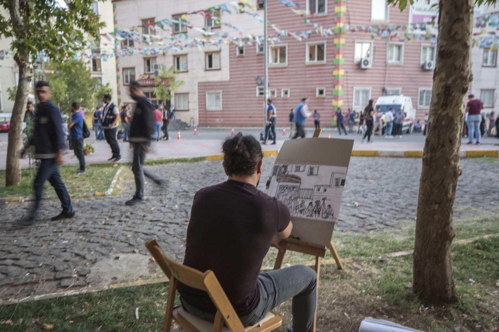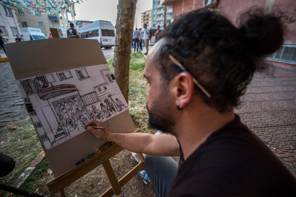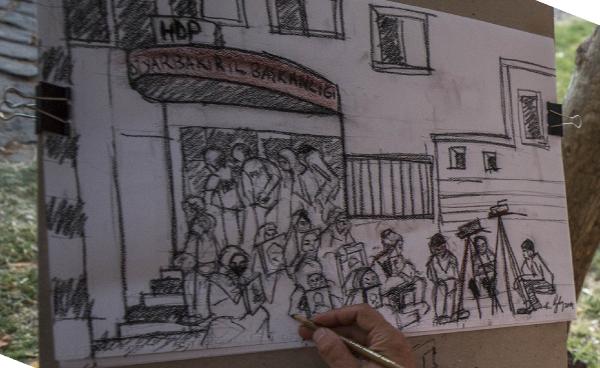 Daha önce 15 Temmuz darbe girişimini yaptığı tablolarla protesto eden Artvin Çoruh Üniversitesi Sanat ve Tasarım Fakültesi Öğretim Görevlisi Dr. Kemal Sağlam, Diyarbakır’a gelerek HDP il binası önünde oturan aileleri resmetti. Sanatçı ve akademisyen Sağlam, burada acı bir haykırışın olduğunu belirterek sanatıyla annelerin yanında olduğunu söyledi.