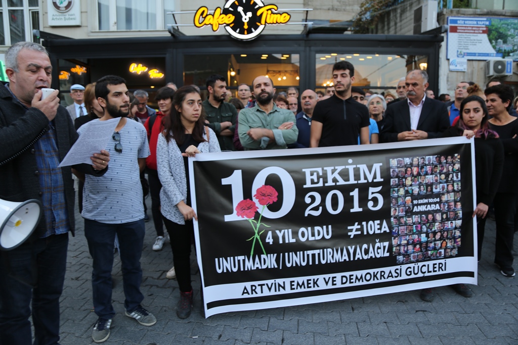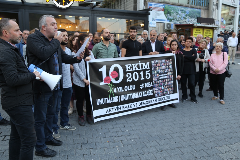 KESK, DİSK, TMMOB ve TTB’nin ‘Emek, Barış ve Demokrasi’ mitingine 10 Ekim 2015 tarihinde IŞİD tarafından gerçekleştirilen, 103 kişinin yaşamını yitirdiği, 500’ün üzerinde insanın yaralandığı katliamın 4’üncü yıl dönümü Artvin’de anıldı. Artvin Emek ve Demokrasi Güçleri tarafından düzenlenen basın açıklaması Halitpaşa Meydanı’nda gerçekleştirildi.