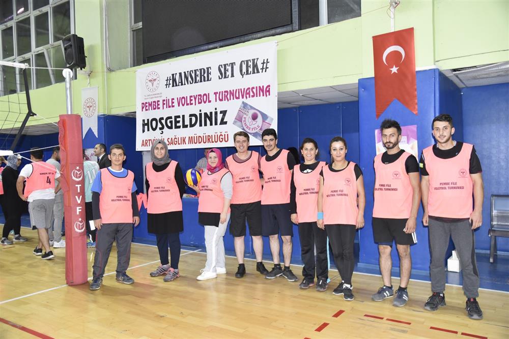 Uzm. Dr. Sibel Ercan konuşmalarında; “Meme kanseri ülkemizde önemli bir halk sağlığı sorunu olup, kadınlarda en sık rastlanan kanser türüdür. Kanserde erken teşhis, tedavi başarısı için en önemli faktördür. Artvin il sağlık müdürlüğü olarak kanserle mücadelede gezici kanser tarama aracımızla köy köy gezerek, ücretsiz olarak erken teşhis için vatandaşlarımıza hizmet veriyoruz. Kanserle mücadelede farkındalık oluşturmak ve halkımızı bilinçlendirmek için “kansere set çek pembe file voleybol turnuvasını” düzenledik. Bu mücadelede bizlere destek vererek takımlarıyla turnuvaya katılan tüm kurumlara, sivil toplum kuruluşlarına, üniversite öğrencilerine ve sporsever tüm halkımıza teşekkürlerimi iletip, katılan takımlara başarılar diliyorum.” dedi.