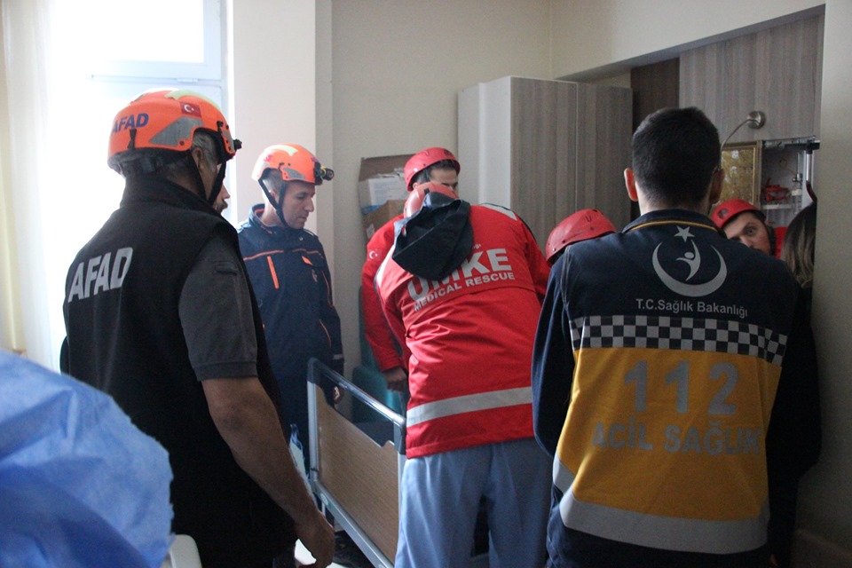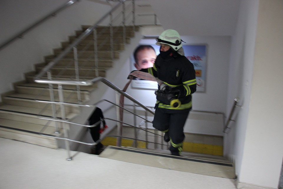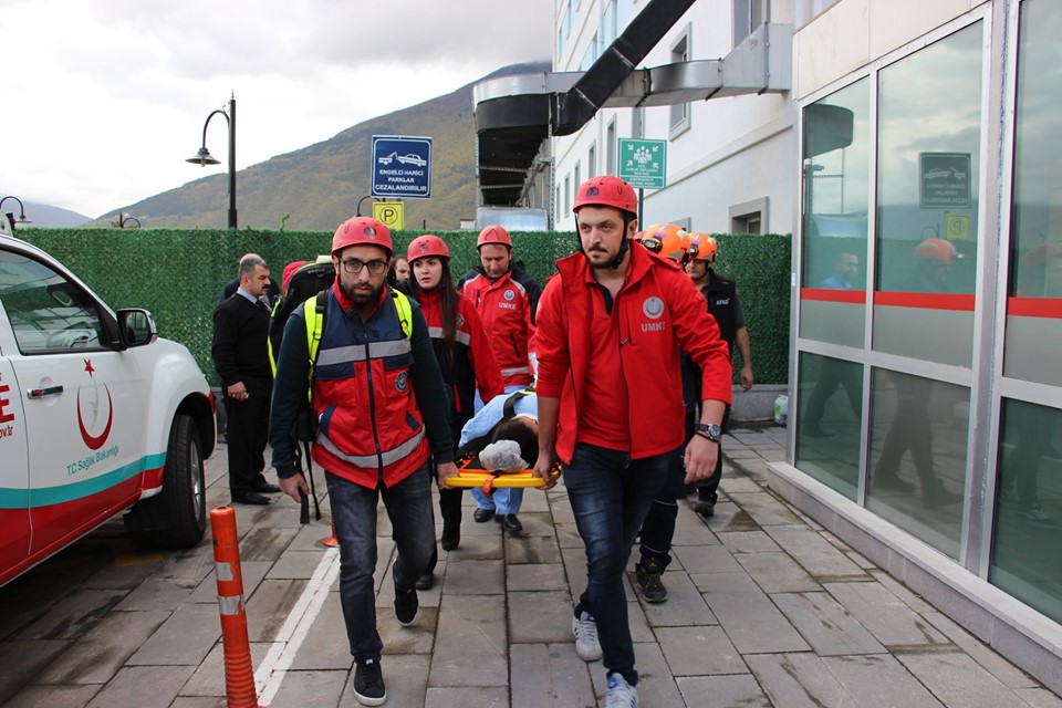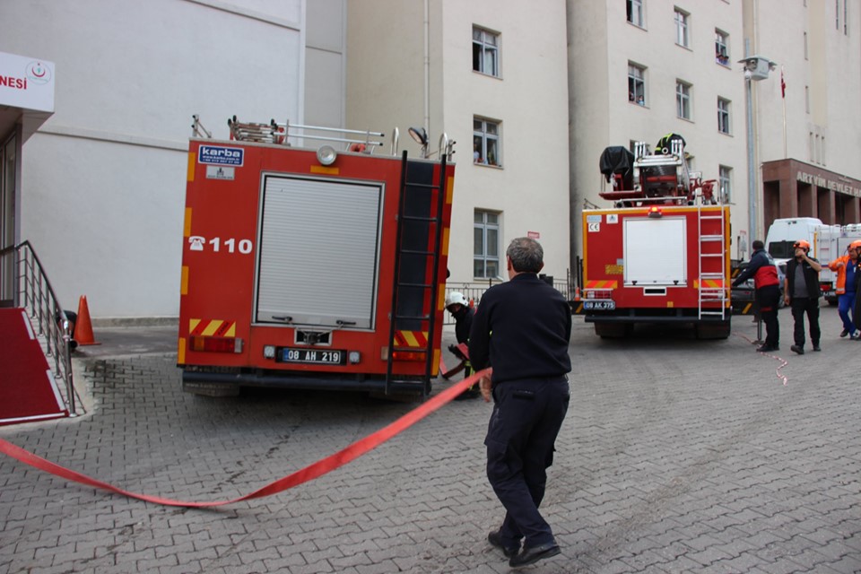 Senaryo gereği hastaneye gelen itfaiye ekipleri itfaiye merdivenleriyle camlardan aldıkları hastaları binadan tahliye ederken yangının çıktığı odaya da müdahalede bulundu. UMKE ve AFAD ekipleri de dumandan etkilenen ve ilk müdahalesi yapılan hastaları sedyelerle ambulanslara taşıdı.
