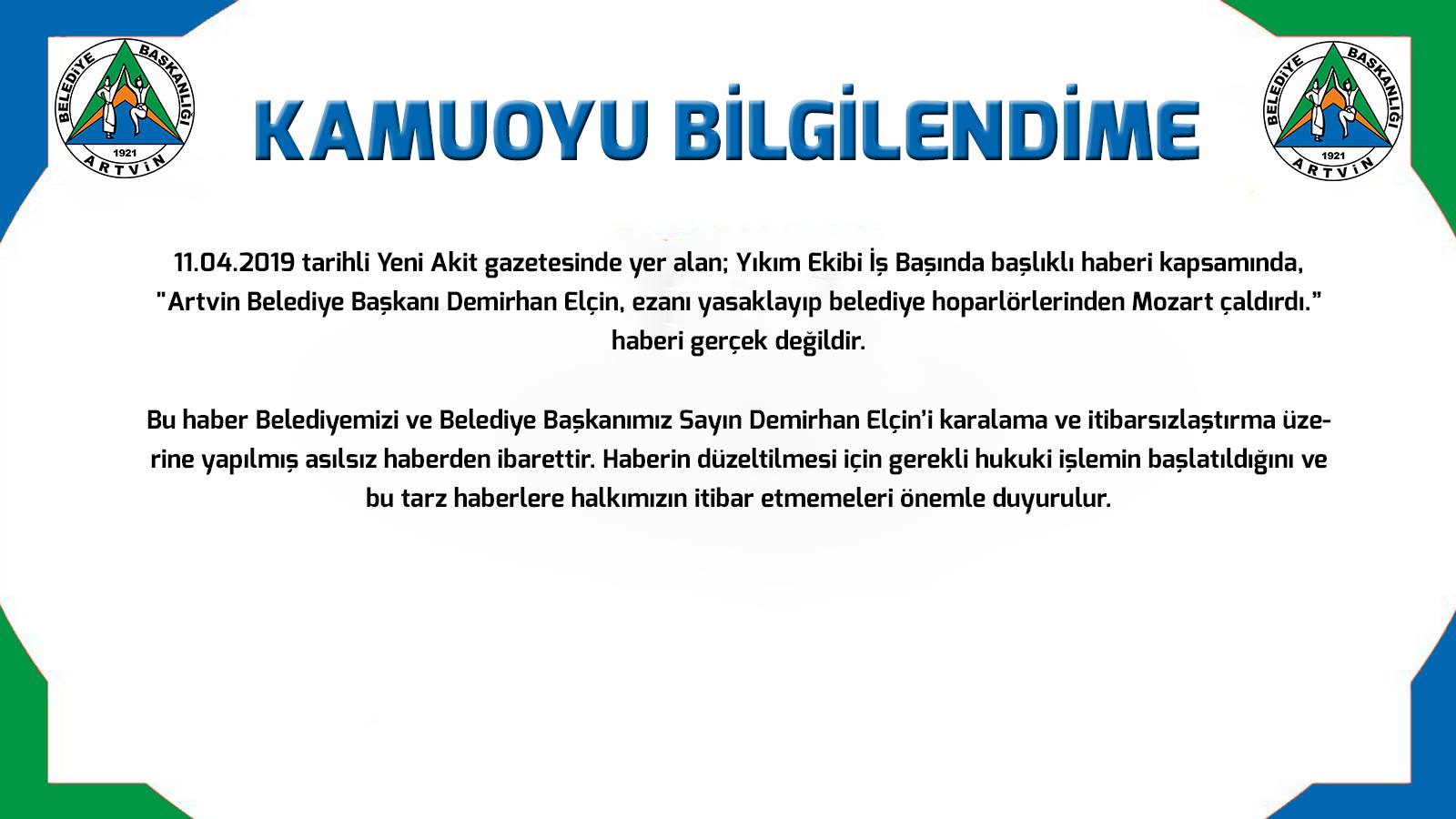 EZAN VE MOZART AÇIKLAMASI ( KAMUOYU BİLGİLENDİRME) 11.04.2019 tarihli Yeni Akit gazetesinde yer alan; 'Yıkım Ekibi İş Başında' başlıklı haberi kapsamında "Artvin Be