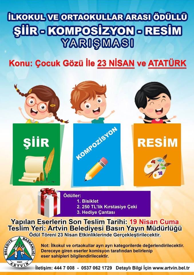 Artvin Belediyesi tarafından düzenlenen “Çocuk Gözüyle 23 Nisan ve Atatürk” konulu Resim, kompozisyon ve Şiir yarışmaları başladı. Artvin Belediyes
