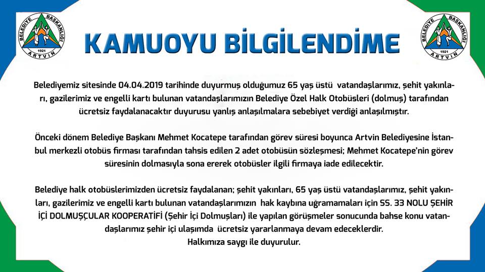Artvin Belediyesi’nden Kamuoyu Bilgilendirmesi Artvin Belediyesi ‘nden kamuoyuna duyuru: “Artvin Belediyesine İstanbul merkezli otobüs firması tarafından tahsis edilen 2 a